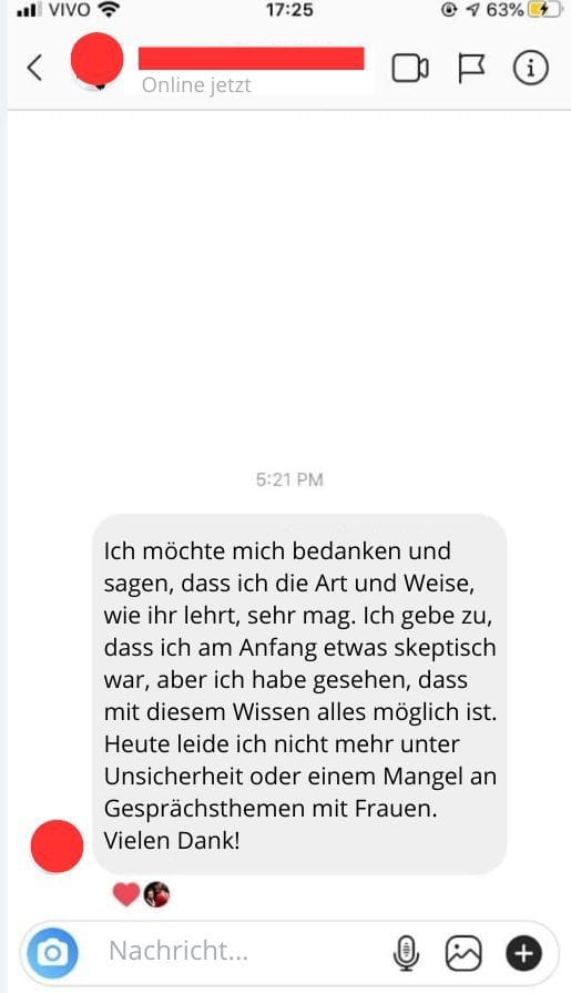 Darüber hinaus werden Sie durch eine mentale Umstrukturierung aufgrund der Steigerung Ihres Selbstwertgefühls, Ihrer Motivation, Kommunikation und hohen Energie natürlich viel attraktiver für Frauen.